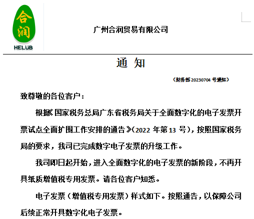 致尊敬的各位客戶: 根據(jù)《國家稅務總局廣東省稅務局關(guān)于全面數(shù)字化的電子發(fā)票開票試點全面擴圍工作安排的通告》(2022年第13號),按照國家稅務局的要求,我司已完成數(shù)字電子發(fā)票的升級工作。 我司即日起開始,進入全面數(shù)字化的電子發(fā)票的新階段,不再開具紙質(zhì)增值稅專用發(fā)票。請各位客戶知悉。 電子發(fā)票(增值稅專用發(fā)票)樣式如下。按照通告,以保障公司后續(xù)正常開具數(shù)字化電子發(fā)票。 電子發(fā)票開出后,由市場部助理以二維碼形式或者PDF、OFD電子版...