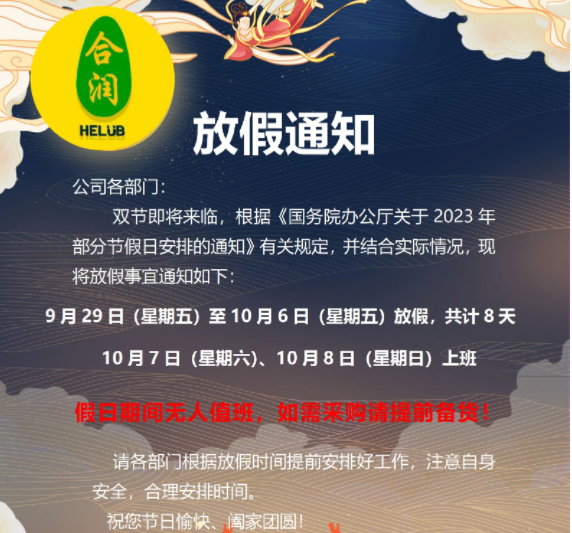 公司各部門: 雙節(jié)即將來臨,根據(jù)《國務院辦公廳關(guān)于2023年部分節(jié)假日安排的通知》有關(guān)規(guī)定,并結(jié)合實際情況,現(xiàn)將放假事宜通知如下: 9月29日(星期五)至10月6日(星期五)放假,共計8天 10月7日(星期六)、10月8日(星期日)上班 假日期間無人值班,如需采購請?zhí)崆皞湄洠? 請各部門根據(jù)放假時間提前安排好工作,注意自身安全,合理安排時間。 祝您節(jié)日愉快、闔家團圓! &...