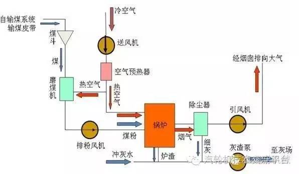 燃燒系統是由輸煤、磨煤、粗細分離、排粉、給粉、鍋爐、除塵、脫硫等組成。是由皮帶輸送機從煤場通過電磁鐵、碎煤機送到煤倉間的煤斗內,再經過給煤機進入磨煤機進行磨粉,磨好的煤粉通過空氣預熱器來的熱風,將煤粉打至粗細分離器,粗細分離器將合格的煤粉(不合格的煤粉送回磨煤機),經過排粉機送至粉倉,給粉機將煤粉打入噴燃器送到鍋爐進行燃燒。而煙氣經過電除塵脫出粉塵再將煙氣送至脫硫裝置,通過石漿噴淋脫出硫的氣體經過吸風機送到煙筒排入天空。