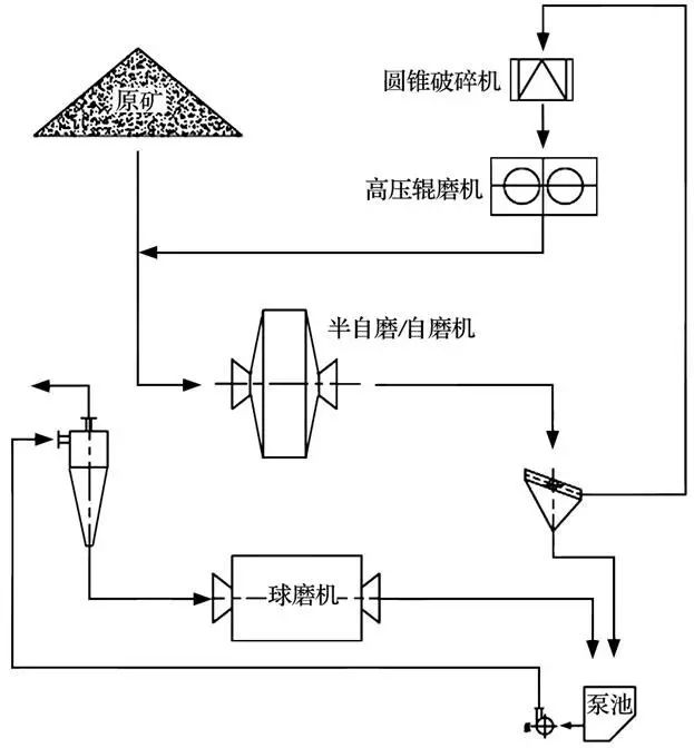 圖2(b) 所示為高壓輥磨機作為頑石破碎機,輥壓產品分級后進入球磨機工藝。該工藝頑石經圓錐破碎機破碎后進入高壓輥磨機,輥壓產品篩分后,篩上產品返回高壓輥磨機破碎,篩下產品給入旋流器給礦泵池。該工藝因頑石破碎后不返回自磨/半自磨機,可以釋放自磨/半自磨的產能,但多了一次篩分工藝,流程相對復雜,適合輥壓后產品中細粉含量較多的情況。