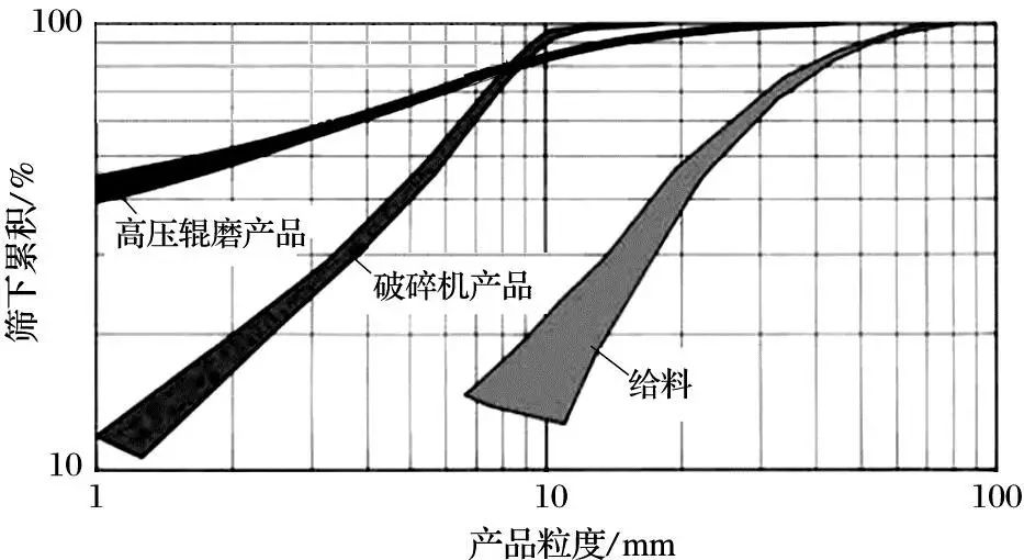 圖3 高壓輥磨機與圓錐破碎機產品粒度分布對比